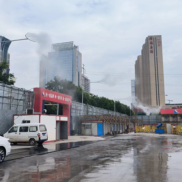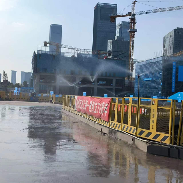 該項目A、B、C區(qū)目前處于底板施工階段,針對揚塵管控,新城公司項目管理團隊嚴格按照“十達標”管理標準進行施工,在出入口規(guī)范設(shè)置沖洗平臺,并配合高壓水槍等設(shè)備對進出車輛進行全方位沖洗,杜絕了車輛帶泥上路。施工現(xiàn)場配備霧炮機、高桿噴淋進行360°旋轉(zhuǎn)降塵。同時,項目安排專人對施工道路進行清掃,灑水車不間斷灑水使道路保持濕潤,進一步提升工地抑塵效果。